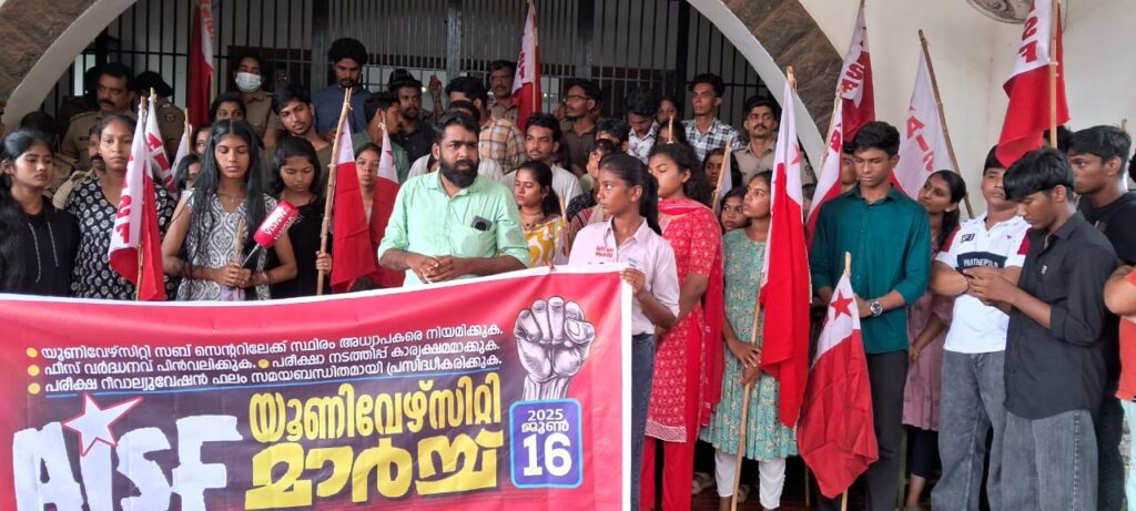 കണ്ണൂർ: സര്വ്വകലാശാലകളെ കാവിവത്ക്കരിക്കുവാനുള്ള വി സി മാരുടെ നീക്കത്തിനെയും സര്വകലാശാലകളിലെ വിദ്യാര്ത്ഥി ചൂഷണത്തിനെതിരെയും ഉന്നത വിദ്യാഭ്യാസ മേഖലയെ സംരക്ഷിക്കുക തുടങ്ങിയ വിവിധ വിഷയങ്ങൾ ഉന്നയിച്ചും എഐഎസഎഫ് കണ്ണൂർ സർവകലാശാലയിലേക്ക് മാർച്ച് നടത്തി.. മാർച്ച് എഐഎസ്എഫ് ദേശീയ എക്സിക്യൂട്ടീവ് അംഗം ആർ എസ് രാഹുൽ രാജ് ഉദ്ഘാടനം ചെയ്തു. ബി ദർശിത്ത് അധ്യക്ഷനായി. സിപിഐ ജില്ലാ എക്സിക്യൂട്ടീവ് അംഗം അഡ്വ പി അജയകുമാർ, കെ കെ സോയ എന്നിവർ സംസാരിച്ചു.നേതാക്കളായ പ്രണോയ് വിജയൻ, കെ പ്രഭിജിത്ത്, വി അമീഷ, ശ്രീപാർവതി, അനിൽ ചന്ദ്രൻ എന്നിവർ നേതൃത്വം നൽകി. സംസ്ഥാന വൈസ് പ്രസിഡണ്ട് പി എ ഇസ്മായിൽ സ്വാഗതവും ജില്ലാ സെക്രട്ടറി സി ജസ്വന്ത് നന്ദിയും പറഞ്ഞു.